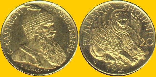 - 9,2 g - 24 mm The obverse has a medallic-like depiction of the throne room within a wreath, and the denomination 2 above the scene. The reverse has the ruler's legend (Amanullah) and date (1298 AH) in a wreath. There are more Afghan gold coins in this section if you are interested - Page Afghanistan ALBANIA Albania is known as the Land of the Eagles. The south-central European area currently known as Albania was originally inhabited by the Illyrians. Illyrian culture is believed to have evolved from the Stone Age and to have manifested itself in the territory of Albania toward the beginning of the Bronze Age, about 2000 BC. Through recorded history, Albania came under the influence of Romans, Greeks, and finally the Ottoman Empire. Albania declared its independence on 28 November 1912. Ahmed Bey Zogu, a chieftain from the Mat region of north-central Albania, became president in 1925 and was declared King Zog I. Italy invaded Albania in 1939 and occupied it for much of World War II. Communists seized control of the country on 29 November 1944. Enver Hoxha, a college instructor who had led the resistance struggle of communist forces, became the leader of Albania by virtue of his post as secretary-general of the party. Hoxha was a ruthless dictator who allied himself with the PRC and ruled Albania like a personal medieval fiefdom. He died in April 1985. The communist regime was overthrown on 20 February 1991. Albania is now regaining its stature as an independent State with close ties to the West. Coinage from what is now Albania started with the Illyrians as early as 400 B.C. Albanian national coinage did not start until 1926. 20 Franga - 1927-V KM-012 - 6,45 g - 21 mm Mintage