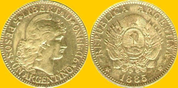 Republican coinage started in 1881. 1 Argentino - 5 Pesos - 1885 KM-006 - 8,06 g - 23 mm Mintage - 0,204M Edge