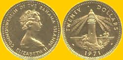 - 6.200 This is an example of NCLT (Non Circulating Legal Tender). The obverse has the bust of Queen Elizabeth II (b1926-) and the inscription COMMONWEALTH OF THE BAHAMA ISLANDS - ELIZABETH II. The reverse has a lighthouse with the denomination TWENTY DOLLARS around the top and the date 1971 at the bottom. There are more Bahamian gold coins in this section if you are interested - Page Bahamas BAHRAIN Bahrain is a emirate located on an island group at the west of the Arabian Gulf. The original civilization was the trading empire of Dilmun, founded during the Bronze Age around 3000 BC and lasting in one form or another for over 2000 years. It was later a vassal state of Assyria and, still later, of Babylonia. The inhabitants adopted Islam in the seventh century AD. Many forces held Bahrain but the Persians held it until the current ruling family, Al-Khalifa, expelled the Persians in 1780s. Oil was discovered in 1932 under the British protectorate which lasted until 1971 when Bahrain gained independence. Bahrain's coins are minted at the British Royal Mint. (10