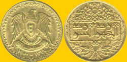Francs - 1883 KM-031.1 - 6,45 g - 21 mm Edge - Reeded Mintage - 0,250M The coin was minted at the Bern mint. The obverse features a bust of Liberty with LIBERTAS spelled out of the tiara. The surrounding Latin legend is HELVETIAN CONFEDERATION. The reverse has the nation arms within a wreath with a star above, the denomination to the sides and the date below. The is the reeded edge variety. There are more Swiss gold coins in this section if you are interested - Page Switzerland SYRIA Syria had a strategic position in the ancient world, and its coastal towns became important Phoenician trading posts. Later, Syria was a pivotal part of the Roman, Persian, Egyptian and Babylonian empires. It finally ended up as part of Ottoman Turkey and, along with Lebanon, was given to France as a protectorate when the Turkish Empire broke up after WWI. In 1932, Syria had its first parliamentary elections, and although the candidates had been picked by the French, they refused to accept France's proposed constitution for the country. In 1939, France granted Turkey the Syrian province of Alexandretta, further sharpening feeling against them. France promised independence in 1941 but didn't come through with it until 1946. Civilian rule didn't last long in Syria: in 1954, after several military coups, the Ba'athist section of the army took over the country. The Ba'ath Party was founded in 1940 by a Christian teacher and was committed to a form of pan-Arabism under which Syria would forfeit its sovereignty. This led to the formation of a United Arab Republic with Egypt in 1958, but a series of military coups trundled across the country. By 1966 the Ba'ath were back in power. Former, Defence Minister Hafez al-Assad seized power and held the presidency to his death in 2000, when his son succeeded him £