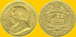 - 0,150M This coin's obverse depicts King Alexander I (b1888-d1934) encircled by the Serbian inscription ALEXANDER I KING OF YUGOSLAVIA. King Alexander was assassinated during a state visit to Marseilles, France by an exiled Croat. The coin designer's name is below the bust. These coins were counterstamped with either a sword or a wheat corn for use in Bosnia or Serbia, constituent republics within the Yugoslav Federation. This one has the wheat counterstamp. The reverse has the arms of the Kingdom encircled with the Serbian inscription KINGDOM OF YUGOSLAVIA and the date. At the bottom is the denomination with Dukat in both Roman and Cyrillic characters. There are more Yugoslav gold coins in this section if you are interested - Page Yugoslavia ZUID AFRIKAANSCHE REPUBLIEK In the 1830es, Boers had migrated from the Cape Colony into the interior to escape the hated British rule, and settled the area beyond the Vaal river. Having defeated the Zulu and Matabele, in 1839, they proclaimed the ZUID-AFRIKAANSCHE REPUBLIEK, and the republics of Lydenburg and Zoutpansberg. The British recognized the Zuidafrikaanse Republiek in 1852. The three republics merged into a unified Zuid Afrikaanse Republiek in 1857. The capital was established at Pretoria (founded 1855). The parliament, called Volksraad (people's council) had 24 members. In 1877, the republic, practically bankrupt, was annexed by Britain. In 1880, the Boers revolted, again proclaiming their independence. Invading British forces were defeated by the Boers in 1881 in the Battle of Majuba Hill. In 1886 gold was found at Witwatersrand near Johannesburg; it proved to be the world's richest gold deposit. Johannesburg boomed. In 1890, the tiny Boer republic of Klein Vrijstaat was incorporated into the Z.A.R.; in 1894 Swaziland was declared a protectorate of the Zuid-Afrikaanse Republiek. The Boers strictly separated the white Boer settlers from both the native African population and the miners and fortune hunters at Johannesburg, whom they regarded foreigners, denying both political participation. Cecil Rhodes, entrepreneur, prime minister of the Cape and colonial politician, provoked the Boer Wae (1899-1902) which resulted in the annexation of what the British called Transvaal by Britain in 1902. £