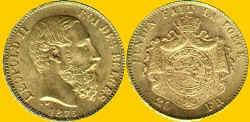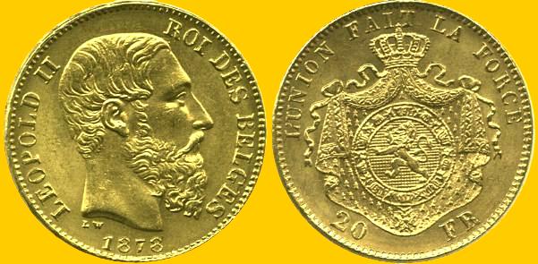 The obverse features a bust of King Leopold II (b1835-d1909). The legend LEOPOLD II ROI DES BELGES (Leopold II King of the Belgians) surrounds the bust. The designer's initials LW are below the bust along with the date 1875. The reverse has the Belgian arms with the French legend L'UNION FAIT LA FORCE (Unity makes Strength) around the top. The denominations flank the the bottom of the arms.