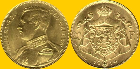 The obverse displays a bust of King Albert (b1876-d1934) surrounded by the French legend ALBERT-ROI-DES-BELGES. The reverse has the Belgian arms with the denomination 20 F. flanking the the sides of the arms. The date 1914 is at the bottom.