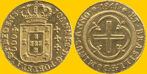 The obverse has the crowned Portuguese coat of arms. The legend JOANNES-D-G-PORT-ET-ALG-REX (John King of Portugal) encircles them. The reverse has a cross within a quatrefoil with the date ANNO 1811 above and the legend ET-BRASILIĆ-DOMINUS (and Lord of Brazil) encircling the cross. THis coin is the small crown variety which was minted at the Rio de Janeiro mint.
