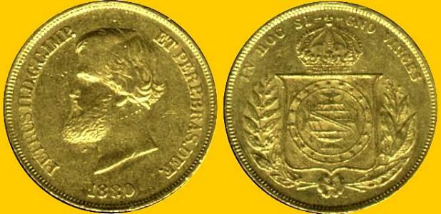 The obverse features a bust of Emperor Dom Pedro II (b1825-d1891). The Latin legend PETRUS II D.G.IMP. ET PERP.BRAS.DEF (Peter II by Grace of God Emperor and Perpetual Defender of Brazil) surrounds the bust. The date 1880 is below the bust along with the date 1875. The reverse has the Imperial arms with the Latin legend IN HOC SIGNO VINCES (In This Sign, You Will Conquer) around the top.