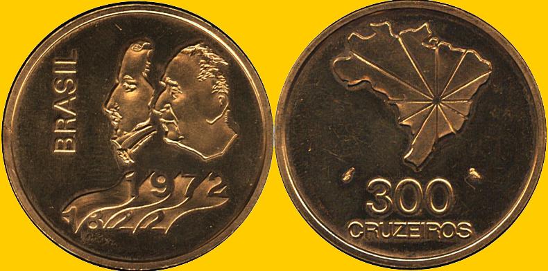 The obverse features busts of Dom Pedro II Dom Pedro II (b1825-d1891), first emperor of independent Brazil and Gen. Emilio Garrastazu Medici (b1905-d1985), the military president in 1972 with the country's name BRASIL to the left and a stylised 1822-1972 below. The reverse has a map of the country with the new capital Brasilia pinpointed and the denomination 300 CRUZEIROS below.