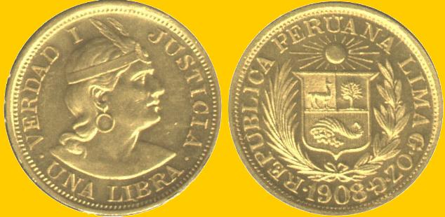The obverse features a bust of an Indian with the Spanish legend VERDAD I JUSTICIA (Truth and Justice) with the denomination UNA LIBRA (one pound at the bottom. The reverse has athe Peruvian coat of arms within a wreath, the country's name REPUBLICA PERUANA, the mint LIMA, GOZG, and the date 1908.