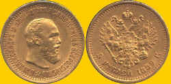 The obverse features Tsar Alexander III (b1845-d1894) with a legend in Old Cyrillic. The reverse has the Russian imperial arms with the denomination 5 RUBLEJ and the date 1889 G (the last character the Cyrillic G for year).5 Rubley - 1897
