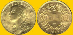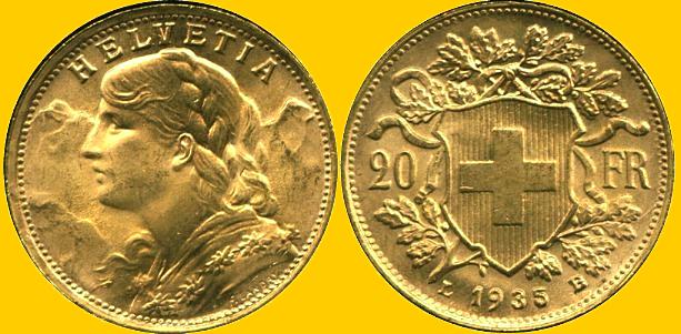 The obverse features a bust of Vreneli, a female head with plaited hair, a garland of flowers (edelweiss?), with mountains behind with the legend HELVETIA (the old Roman name for Switzerland). The obverse was designed by F Landry. The reverse has the the Swiss cross on a ornate shield superimposed on an oak branch with ribbons flanked on the sides by the denomination 20 FR. The date 1930 is below with the mintmark B (for the Bern mint) to the right and L to the left (which denotes that these coins were actually minted in 1946-48).